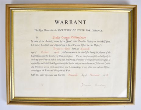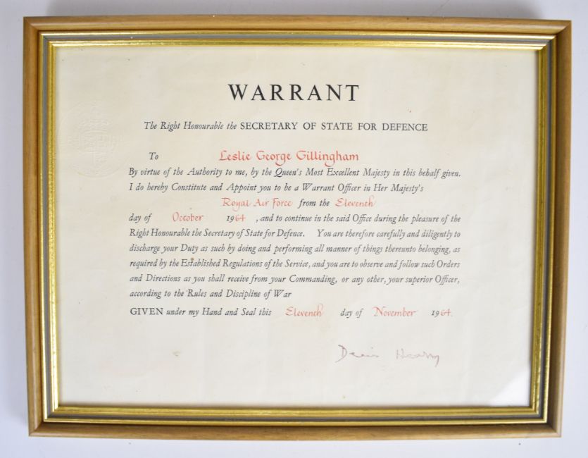 Royal Air Force medal trio and ephemera for Leslie George Gillingham including General Service Medal with clasp for Malaya, General Service Medal with clasp for Borneo and a Long Service & Good Conduct Medal named to Master Engineer L G Gillingham C4023533 RAF, framed warrant appointing him Warrant Officer dated 1964 and signed by Dennis Healey, framed presentation photograph of a Bristol Britannia from 99 Squadron RAF Lynsham July 1969, presentation tankard and brevet badges etc