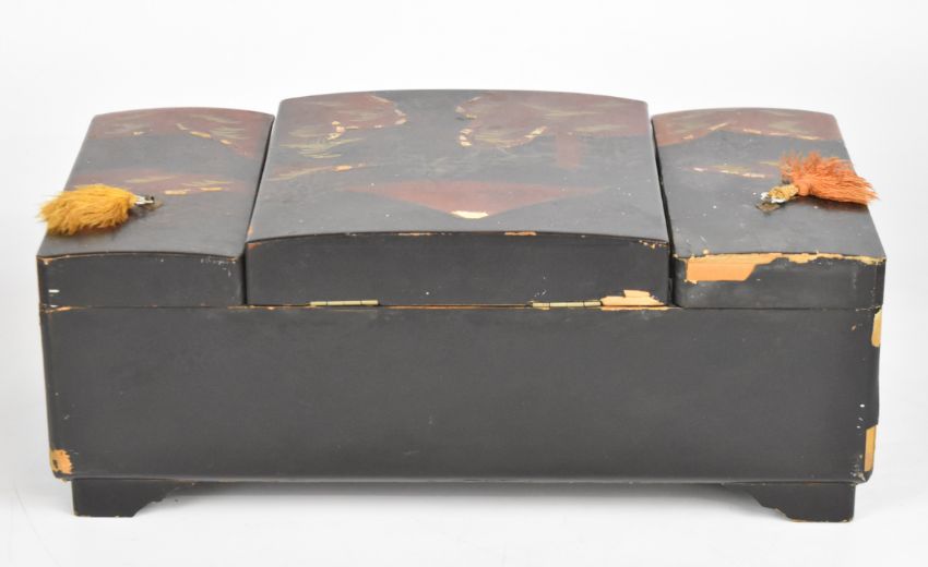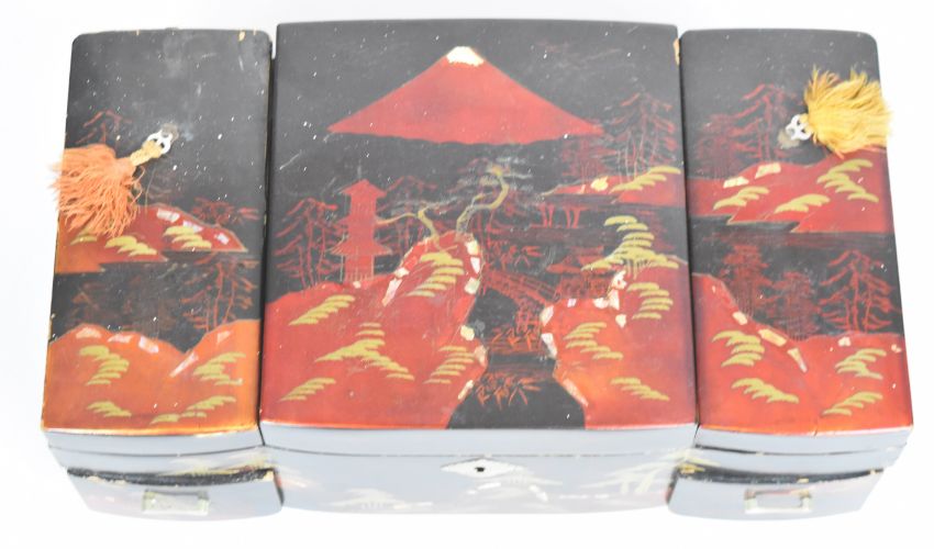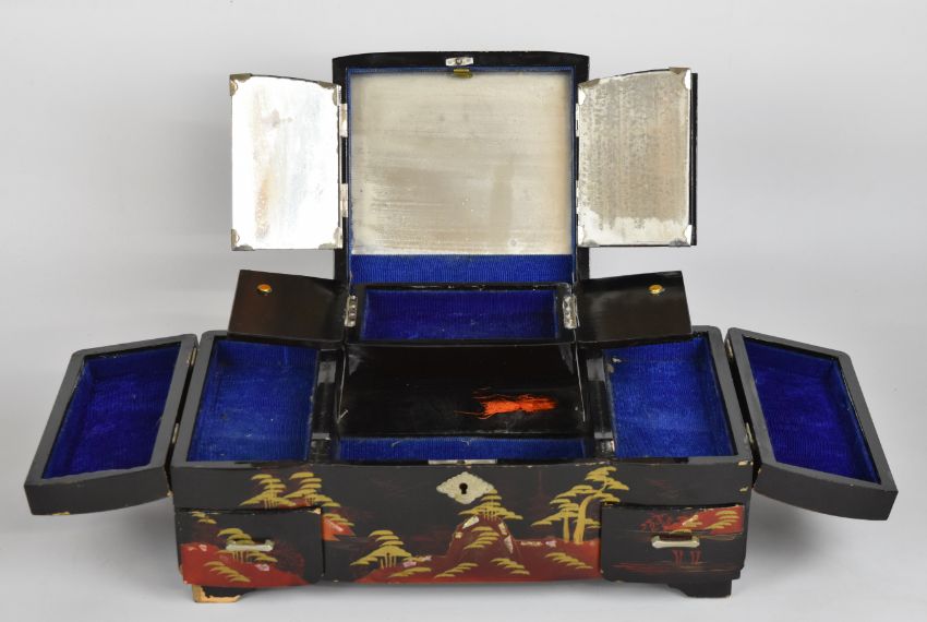 Japanese lacquer and mother of pearl jewellery / vanity case with fitted interior, fold out compartments and two drawers, W37 x D20 x H14cm