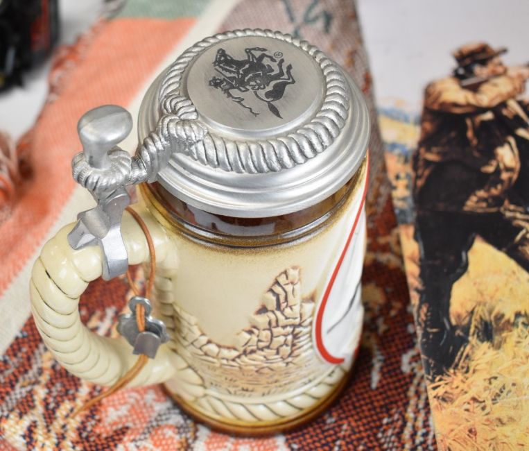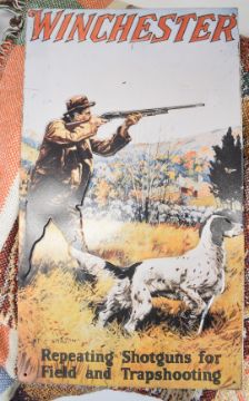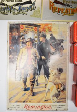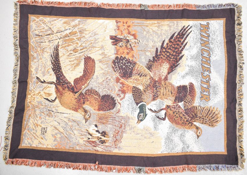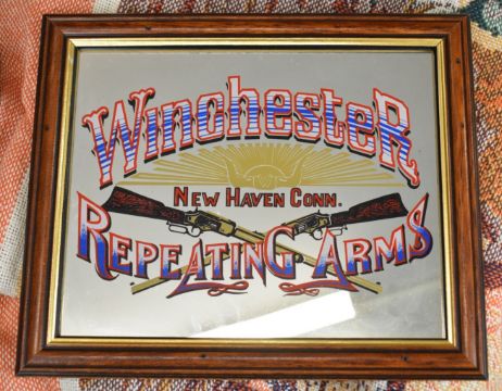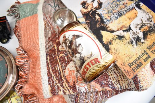 A collection of Winchester signs and ephemera comprising three mirrors, two metal signs, four tins, a clock, stein, three model vehicles and a wool wall hanging or rug.