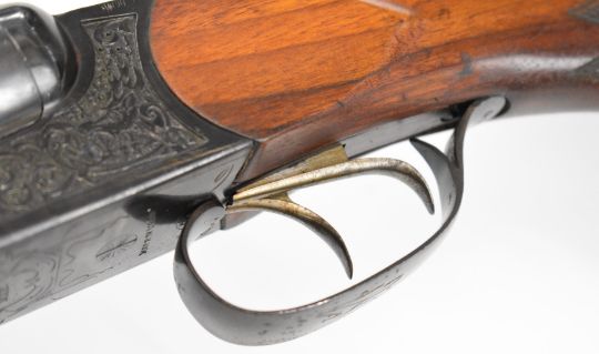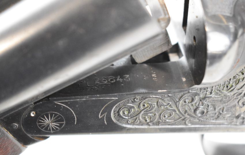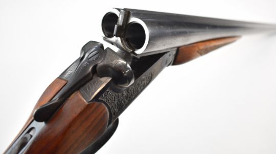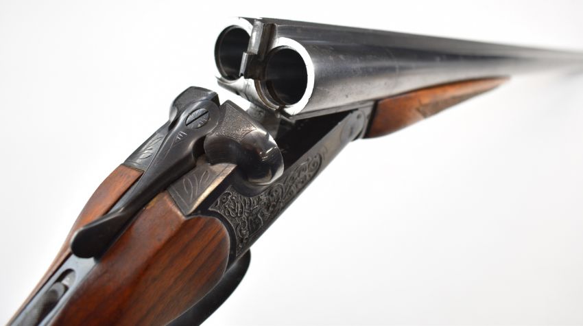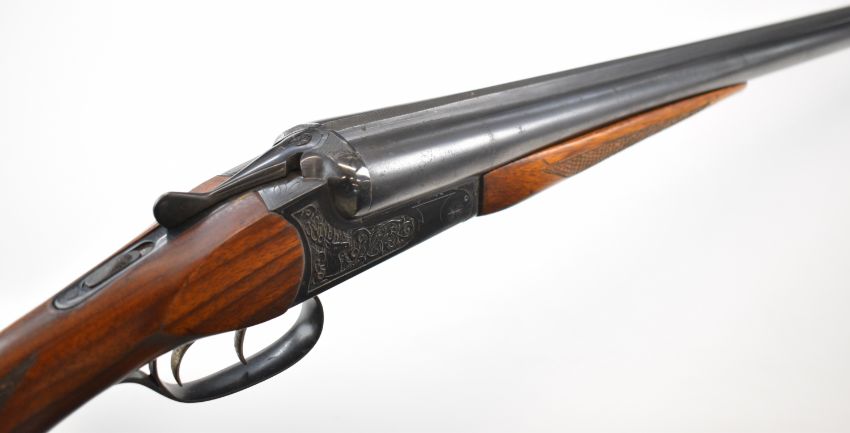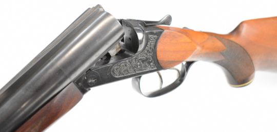 Baikal IJ-58 MAE 12 bore side by side shotgun with deep engraving of of a stag and deer to the locks, chequered semi-pistol grip and beaver tail forend, double trigger and 28.5 inch barrels choked ½ and full, overall length 116cm, length of pull 39cm, serial number C26643. PLEASE NOTE THAT A VALID RELEVANT SHOTGUN CERTIFICATE IS REQUIRED TO VIEW OR PURCHASE THIS LOT AND FOR ALL SHOTGUNS OR RIFLES PLEASE ENSURE YOU HAVE THE RELEVANT CERTIFICATE BEFORE BIDDING.