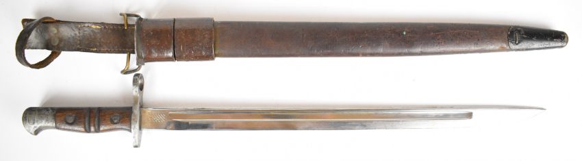 American WW1 Remington bayonet dated 1917 with wooden grips, 43cm fullered blade, scabbard and frog. PLEASE NOTE: WE ARE NOT ABLE TO OFFER OUR USUAL POSTAGE SERVICE FOR THIS LOT