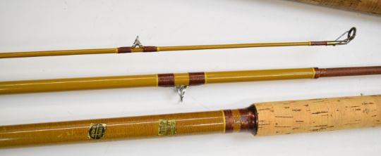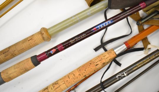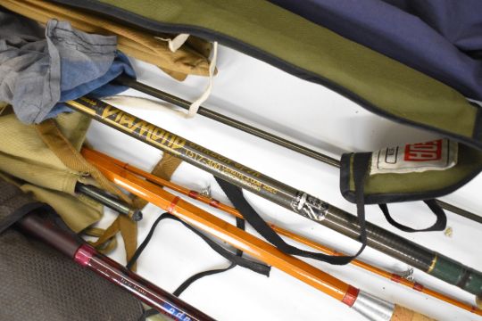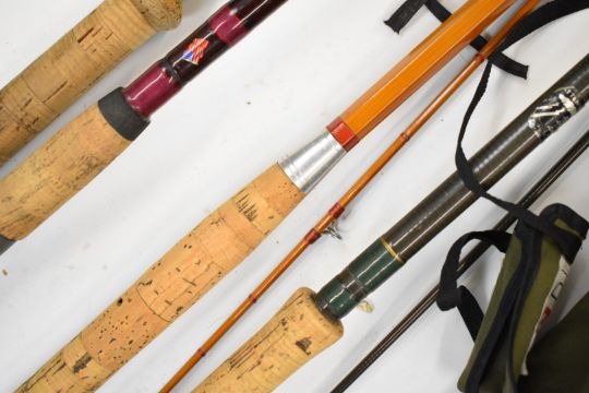 Eight spinning and salmon fly fishing rods including split cane examples, Ron Thompson 'Taupo', Daiwa Osprey Supreme, Dam, Leeda and Shakespeare examples