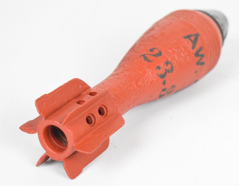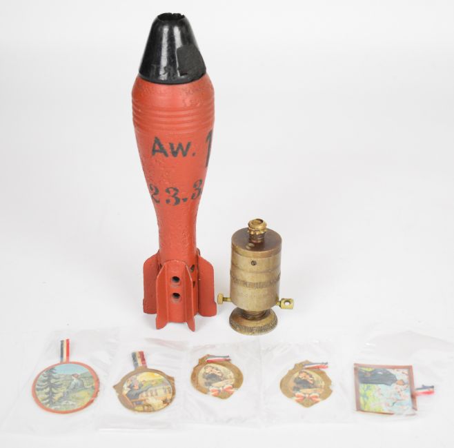 Inert mortar round with plastic cone body stencilled AW14 23.3.41, together with a Teller mine fuse marked RR-492.38 and four French WW1 card / paper tokens