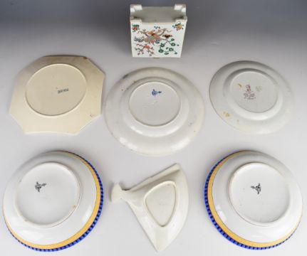 Minton Aesthetic period reticulated bowls, plate, pin dish in the form of a fan, possibly Copeland armorial tea caddy (unmarked), Disraeli plate and a Grimwades Bruce Bainsfather plate etc, largest diameter 26cm