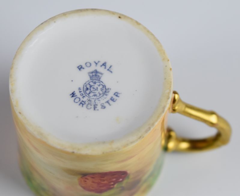Royal Worcester painted fruit coffee can and saucer decorated with peaches, cherries, blackberries and hazlenuts, both signed Moseley, H6cm