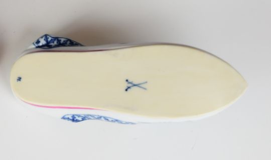 Meissen porcelain slipper with flora and fauna decoration and blue crossed swords to base, L17cm