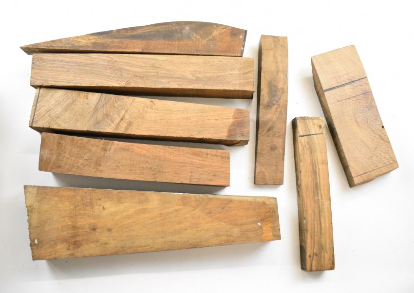 Eight figured walnut shotgun or rifle stock, forend and stock extension blanks, the stock blanks largest 37cm long.
