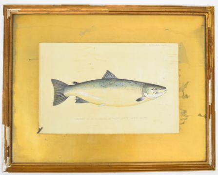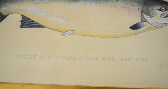 P.D Malloch Perth watercolour study of a Salmon or similar fish, titled 'Caught by W.Vaughan at Rocklands 1937 47lbs' and named top right, 32x50cm, in gilt frame