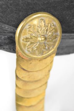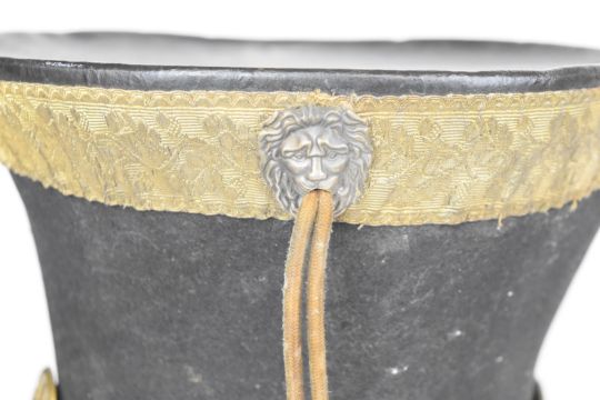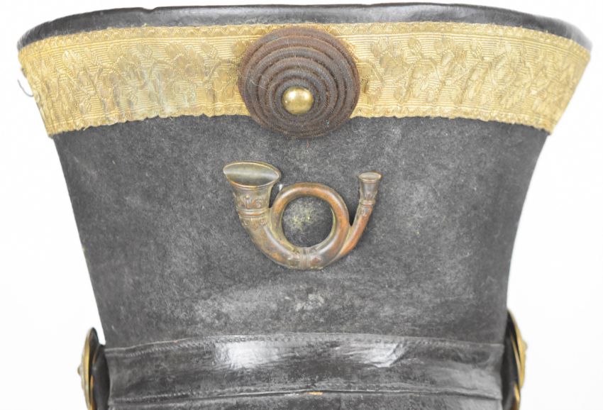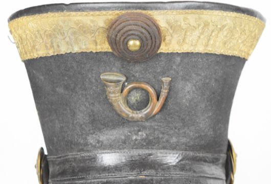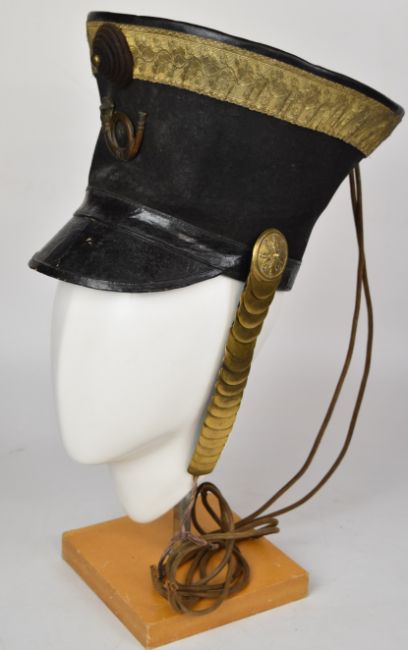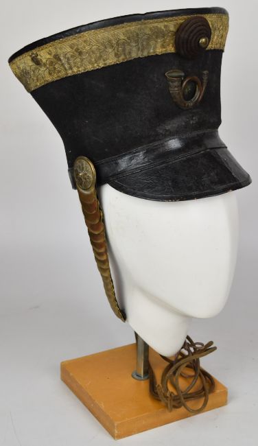 British Army 'Belltop' shako with lace to top, brass chin straps, bugle badge to front, Hamburger Rogers & Co retailer's paper label inside