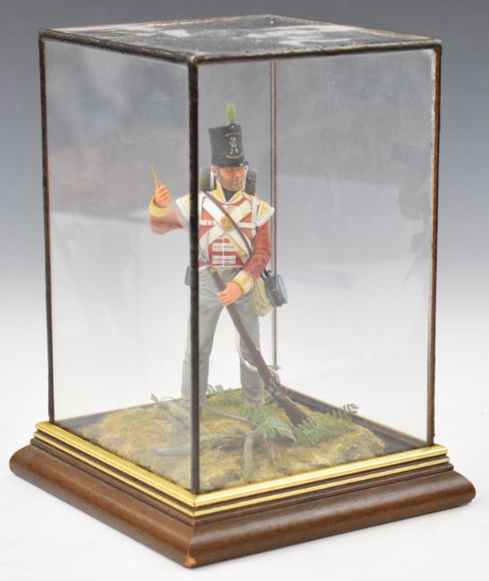 Peninsular War and Waterloo era pewter figure 28th Regiment of Foot on plinth, Pte Philip Wren to inside of plinth, with glass dust cover, 14 x 19cm