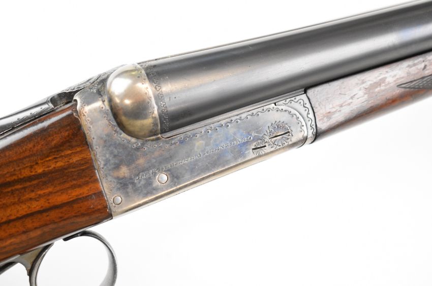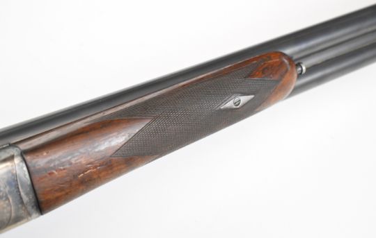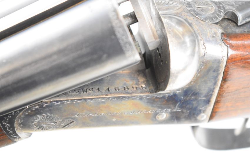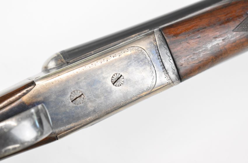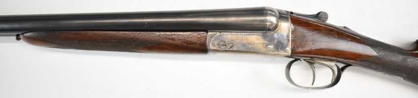 AYA Yeoman 12 bore side by side shotgun with named and border engraved locks, chequered grip and forend, double trigger and named 28 inch barrels choked ½ and ¾, overall length 113.5cm, length of pull 36cm, serial number 146896. PLEASE NOTE THAT A VALID RELEVANT SHOTGUN CERTIFICATE IS REQUIRED TO VIEW OR PURCHASE THIS LOT AND FOR ALL SHOTGUNS OR RIFLES PLEASE ENSURE YOU HAVE THE RELEVANT CERTIFICATE BEFORE BIDDING.