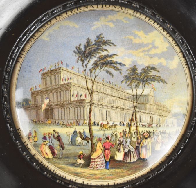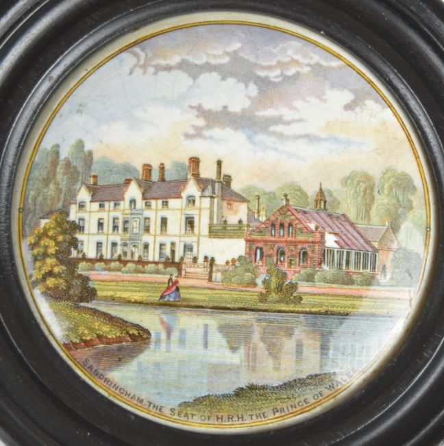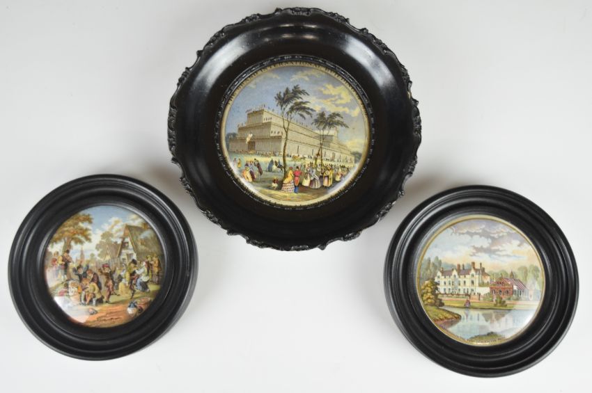 Three Prattware pot lids comprising The Grand International Building of 1851 for Exhibition of Art and Industry, Sandringham and The Village Wedding, largest diameter 13.5cm