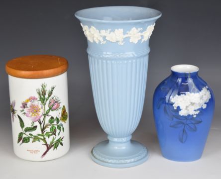 West German mid century modern lava jug, Copenhagen vase, Royal Doulton, Mansion House dwarf figures, Sèvres style porcelain box with miniature teaware, Wedgwood embossed Queensware flared vase etc, tallest 27cm