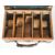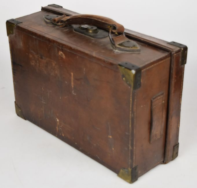Leather and brass bound shotgun cartridge magazine with fitted oak interior, 40x26x15cm.