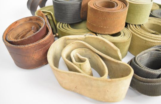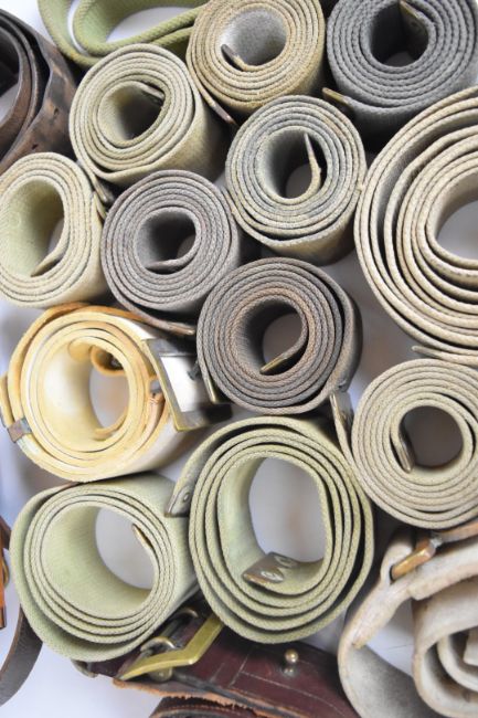 Approximately twenty canvas and leather straps / belts