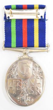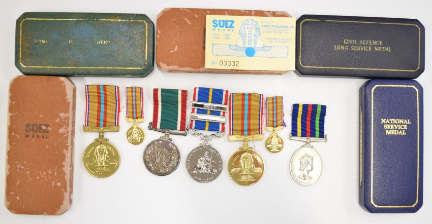 Three unofficial medals comprising two Suez and National Service together with a Women's Voluntary Service Medal and a Civil Defence Long Service Medal, all boxed