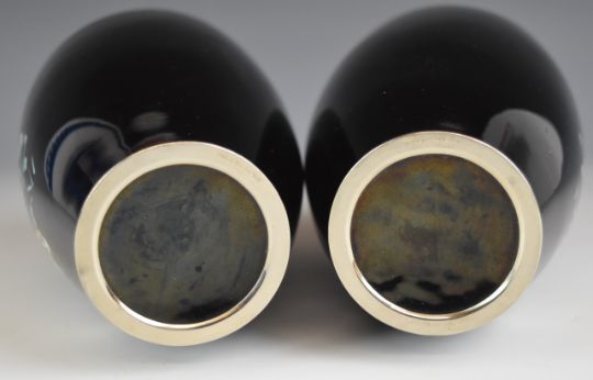Pair of Japanese cloisonné vases with decoration of partridge or quail amongst foliage, H18.5cm