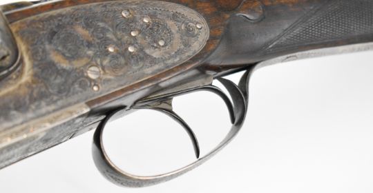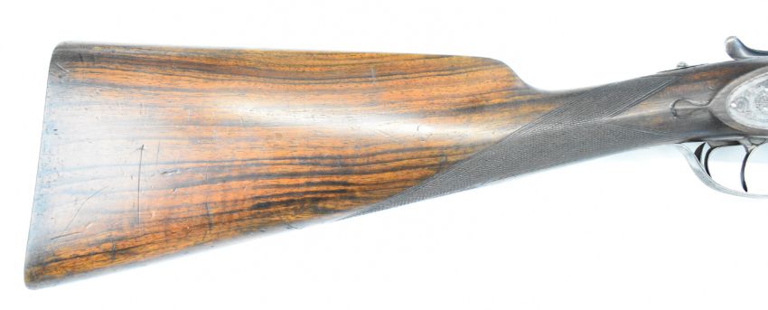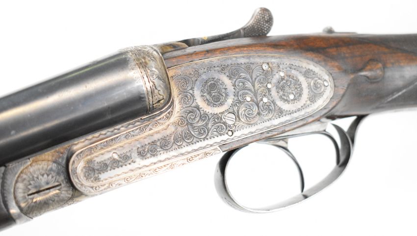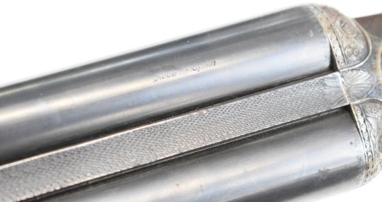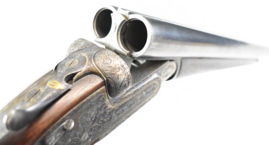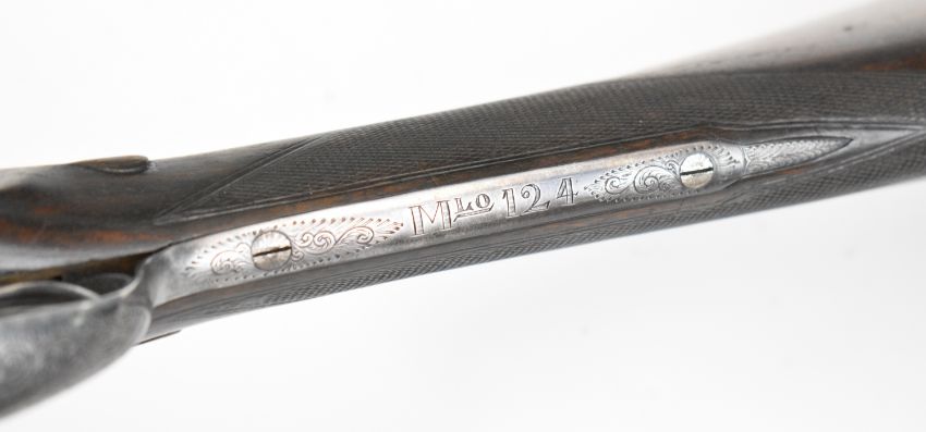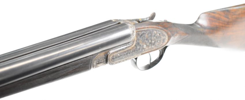 Spanish 12 bore side by side sidelock ejector shotgun with engraved hand detachable locks, underside, trigger guard, top plate, gold named thumb lever and fences, chequered grip and forend, carved teardrop to the wrist, double trigger and 27.25 inch barrels choked ½ and ¾, overall length 112cm, length of pull 36.5cm, serial number 40741. PLEASE NOTE THAT A VALID RELEVANT SHOTGUN CERTIFICATE IS REQUIRED TO VIEW OR PURCHASE THIS LOT AND FOR ALL SHOTGUNS OR RIFLES PLEASE ENSURE YOU HAVE THE RELEVANT CERTIFICATE BEFORE BIDDING.