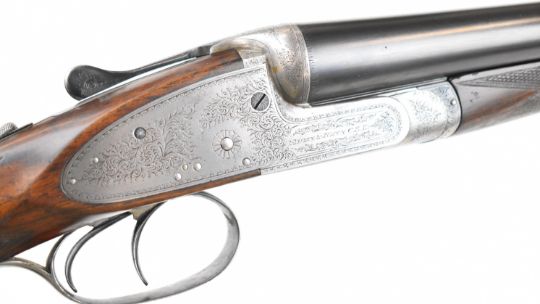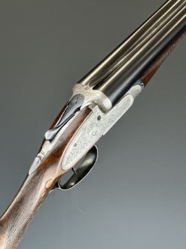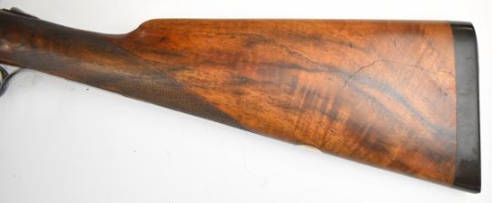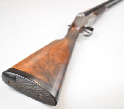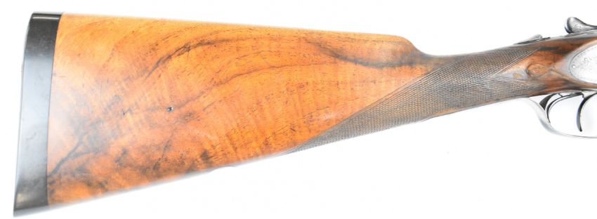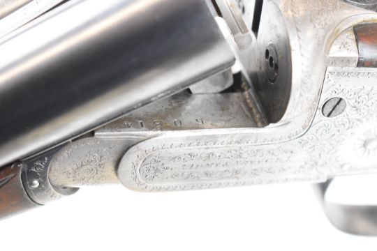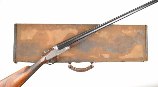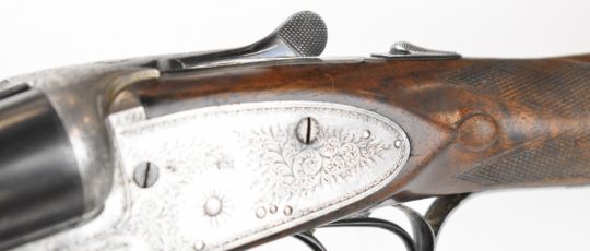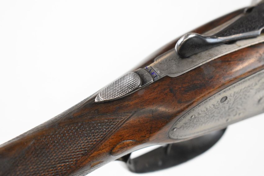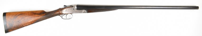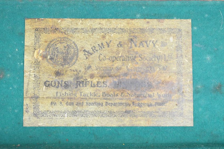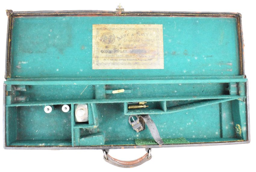 Army & Navy 12 bore sidelock side by side ejector shotgun with named and engraved locks, engraved underside, trigger guard, top plate, thumb lever and fences, blue enamel 'Safe', chequered grip and forend, carved teardrop to the wrist, vacant cartouche to the underside of the stock, double trigger and named 28 inch barrels choked ¼ and cylinder, overall length 113.5cm, length of pull 36cm, serial number 50814, in original canvas and leather case with fitted interior and 'Army & Navy Co-operative Society Ltd 105 Victoria St Westminster SW Guns, Rifles, Pistols, Fishing Tackle, Boats & Naturalist Work No 8 Gun & Sporting Department 3 Howick Place' label. PLEASE NOTE THAT A VALID RELEVANT SHOTGUN CERTIFICATE IS REQUIRED TO VIEW OR PURCHASE THIS LOT AND FOR ALL SHOTGUNS OR RIFLES PLEASE ENSURE YOU HAVE THE RELEVANT CERTIFICATE BEFORE BIDDING.