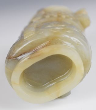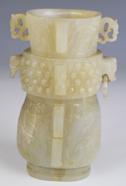 19th/20thC or earlier Chinese carved celadon jade archaic twin handled pedestal vase, H11.5cm