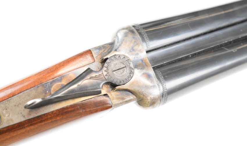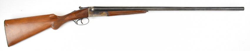Spanish 16 bore side by side shotgun with engraved locks, underside and thumb lever, chequered semi-pistol grip and forend, double trigger and 28 inch barrels, overall length 114.5cm, length of pull 37cm, serial number PG80816. PLEASE NOTE THAT A VALID RELEVANT SHOTGUN CERTIFICATE IS REQUIRED TO VIEW OR PURCHASE THIS LOT AND FOR ALL SHOTGUNS OR RIFLES PLEASE ENSURE YOU HAVE THE RELEVANT CERTIFICATE BEFORE BIDDING.