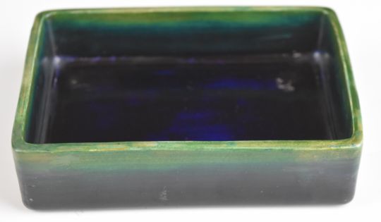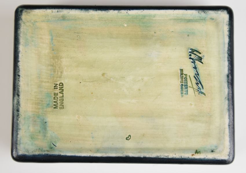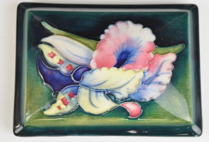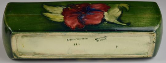 Moorcroft covered box decorated in the Orchid pattern and a trough with Hibiscus decoration, length 19.5cm