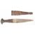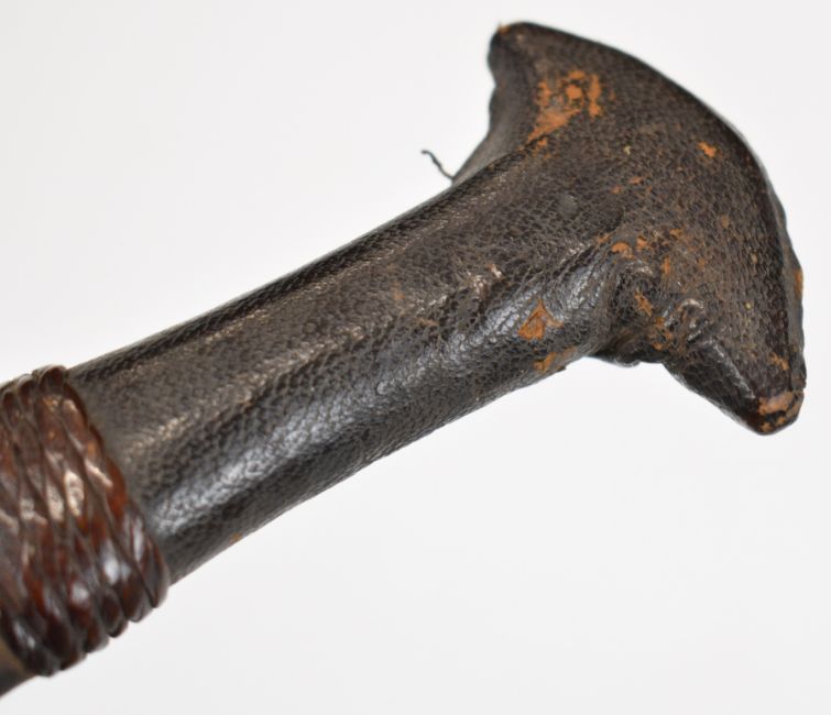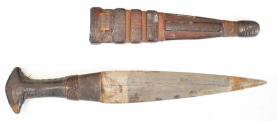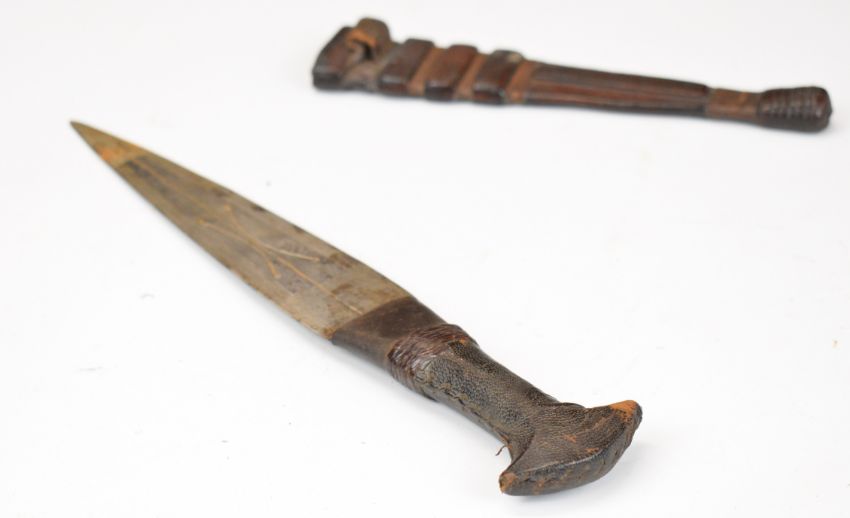 Tribal dagger with skin covered grip, 19cm double edged blade and sheath. PLEASE NOTE: WE ARE NOT ABLE TO OFFER OUR USUAL POSTAGE SERVICE FOR THIS LOT