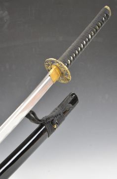 Japanese Samurai sword with bound grip, two menuki, decorated tsuba and 73cm blade, together with fitted case and stand. PLEASE NOTE: WE ARE NOT ABLE TO OFFER OUR USUAL POSTAGE SERVICE FOR THIS LOT