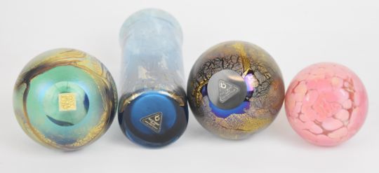 Four pieces of Isle of Wight and Mdina glass comprising three scent bottles and a vase, all signed or with original labels to the bases, largest 16.5cm tall.