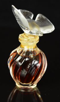 Six Lalique/ Nina Ricci glass scent bottles four with bird stoppers, all signed or with original labels to base, largest 12.5cm tall.