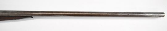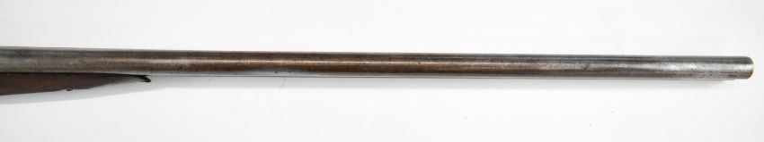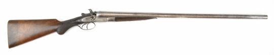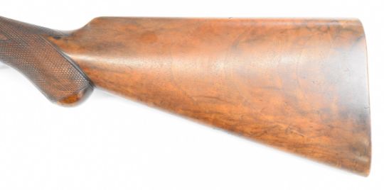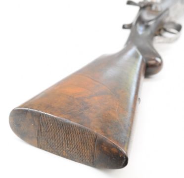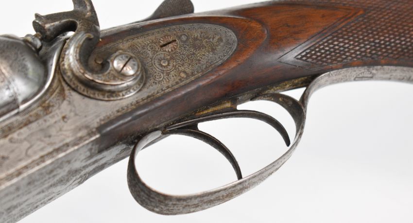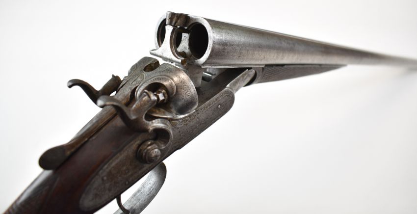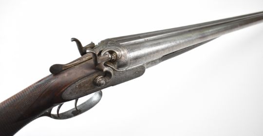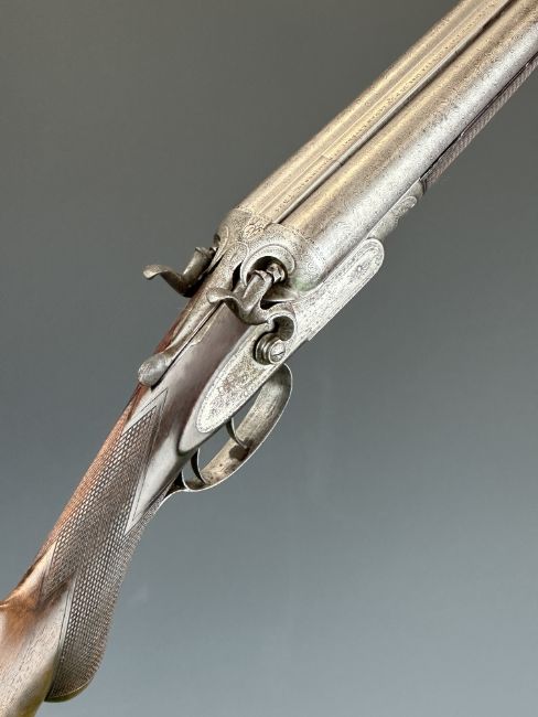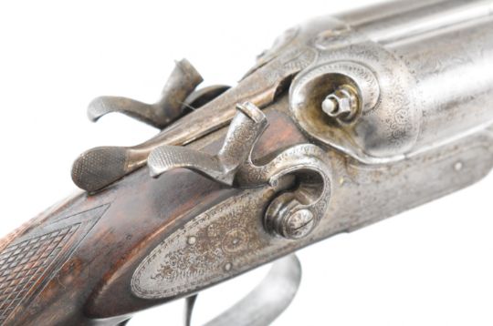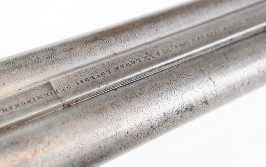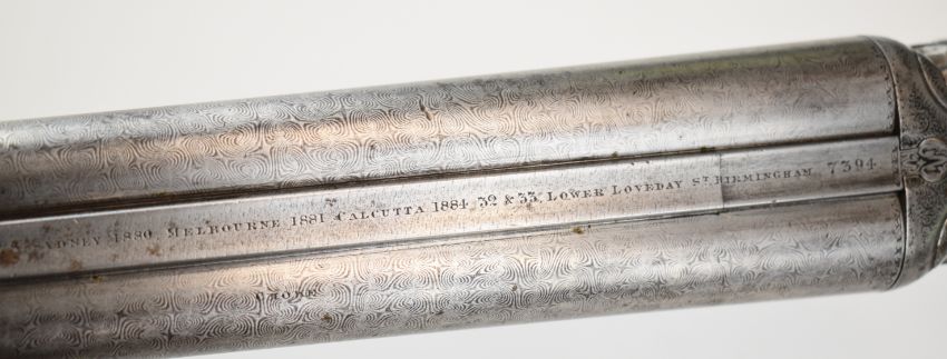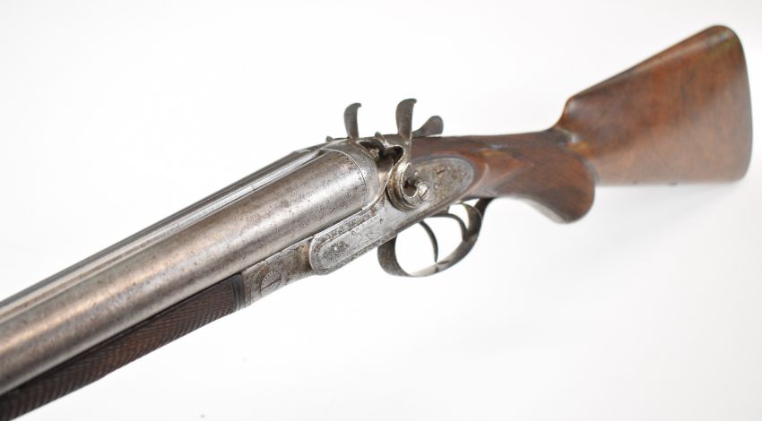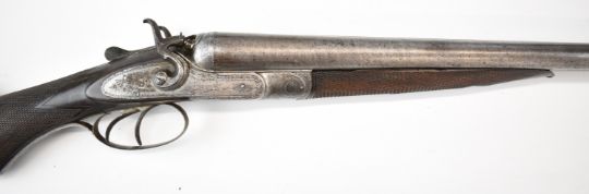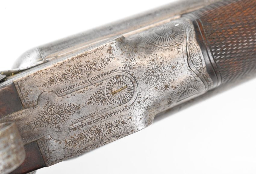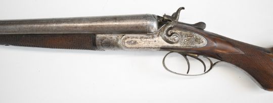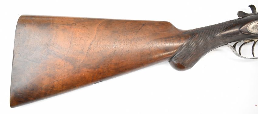 George Edward Lewis 12 bore side by side hammer action shotgun with named and engraved locks, engraved hammers, trigger guard, top plate, thumb lever and fences, chequered semi-pistol grip and forend, double trigger and named 30 inch Damascus barrels choked ½ and ¼, overall length 118.5cm, length of pull 35.5cm, serial number 7394. PLEASE NOTE THAT THIS GUN IS BEING SOLD AS STOCK AND ACTION ONLY AND THAT A VALID RELEVANT RFD CERTIFICATE IS REQUIRED TO VIEW OR PURCHASE THIS LOT.
