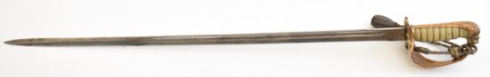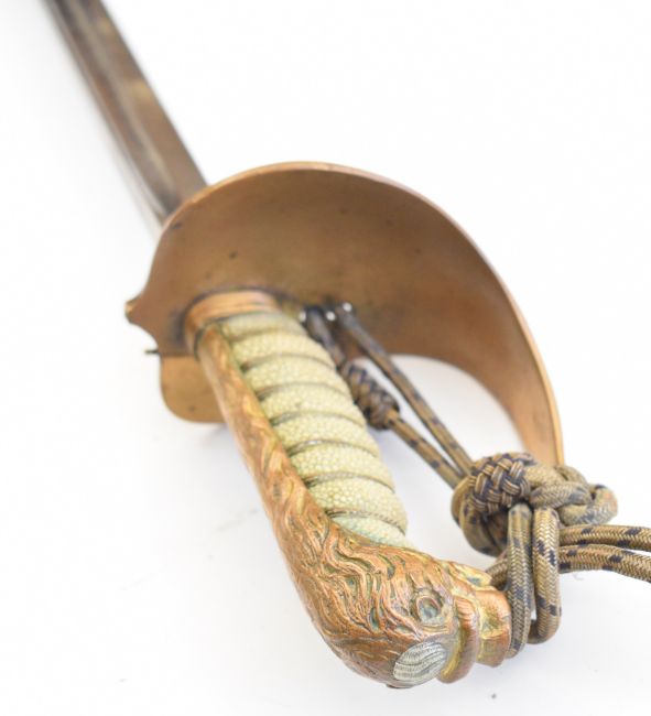 Royal Navy Reserve officer's dress sword with RNR fouled anchor to folding guard, George V cypher to 79cm decorated blade, scabbard and knott
