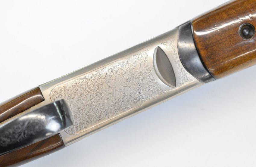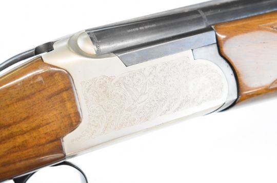 Lanber 12 bore over and under shotgun with engraved birds surrounded by scrolling decoration to the locks and underside, engraved trigger guard, top plate and thumb lever, chequered semi-pistol grip and forend, single trigger, vented top rib and 29.5 inch barrels choked ½ and full, overall length 117.5cm, length of pull 37cm, serial number 252292. PLEASE NOTE THAT A VALID RELEVANT SHOTGUN CERTIFICATE IS REQUIRED TO VIEW OR PURCHASE THIS LOT AND FOR ALL SHOTGUNS OR RIFLES PLEASE ENSURE YOU HAVE THE RELEVANT CERTIFICATE BEFORE BIDDING.