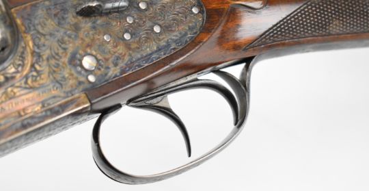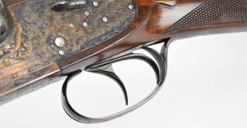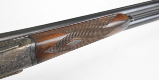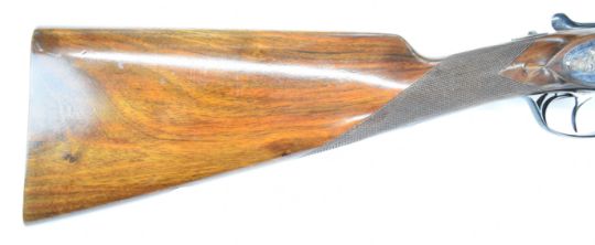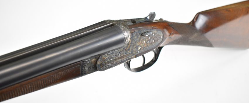 AYA No 2 12 bore side by side sidelock ejector shotgun with named and engraved hand detachable locks, engraved underside, trigger guard, top plate, thumb lever and fences, chequered grip and forend, carved teardrop to the wrist, vacant cartouche to the underside of the stock, double trigger and named 26 inch barrels choked ½ and ¼, overall length 109.5cm, length of pull 37.5cm, serial number 406876, in original box with certificate. PLEASE NOTE THAT A VALID RELEVANT SHOTGUN CERTIFICATE IS REQUIRED TO VIEW OR PURCHASE THIS LOT AND FOR ALL SHOTGUNS OR RIFLES PLEASE ENSURE YOU HAVE THE RELEVANT CERTIFICATE BEFORE BIDDING.