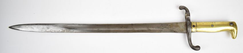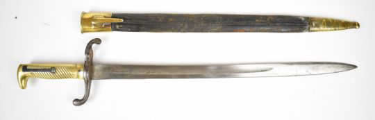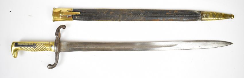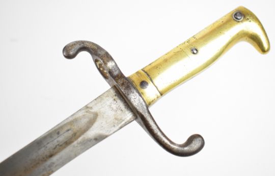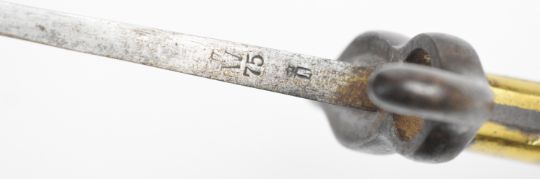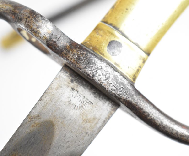German 1871 pattern bayonet with brass grip, E Wilhelm to the ricasso, stamped W&S to spine of 46.5cm blade and with regimental number to crossguard and scabbard. PLEASE NOTE: WE ARE NOT ABLE TO OFFER OUR USUAL POSTAGE SERVICE FOR THIS LOT