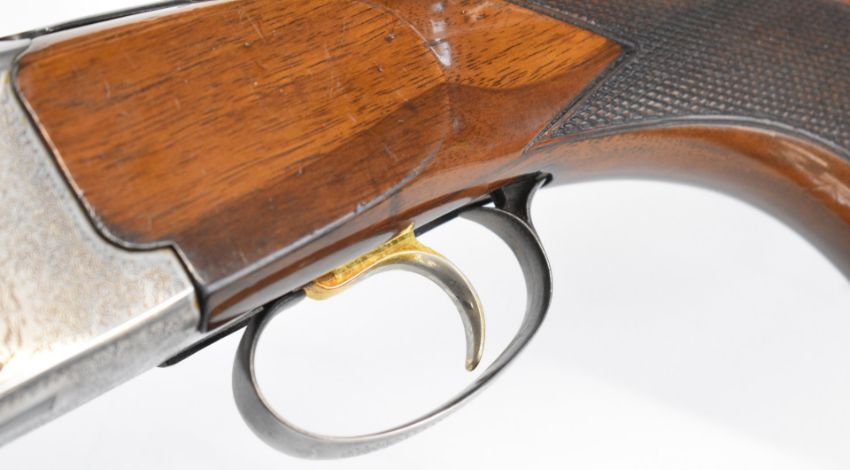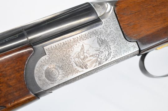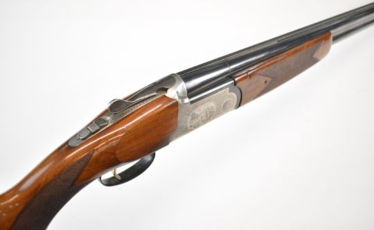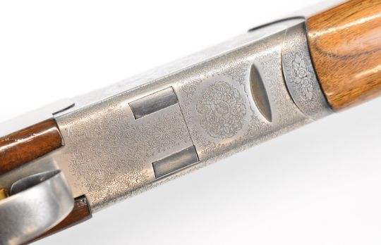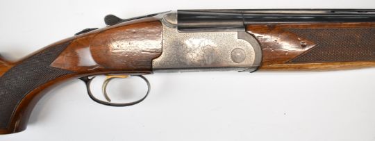 Lincoln 12 bore over and under ejector shotgun with engraved scenes of dogs and birds to the locks, engraved underside, trigger guard, top plate and thumb lever, chequered semi-pistol grip and forend, single trigger, vented top rib and 27.75 inch barrels choked ¼ and improved cylinder, overall length 114cm, length of pull 36cm, serial number 24883. PLEASE NOTE THAT A VALID RELEVANT SHOTGUN CERTIFICATE IS REQUIRED TO VIEW OR PURCHASE