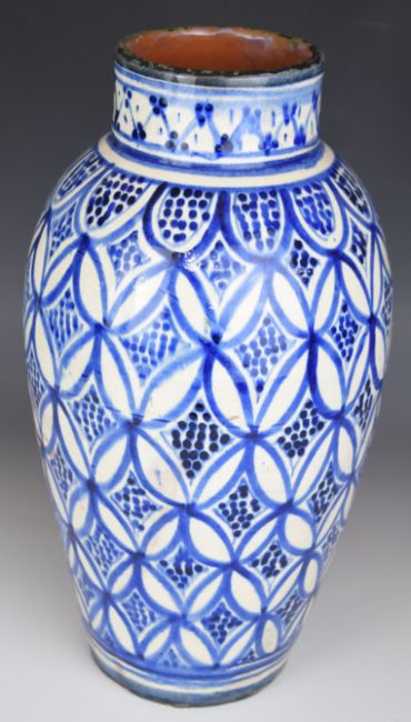 Indian / Eastern blue and white pottery vase with faint script to base, H39cm