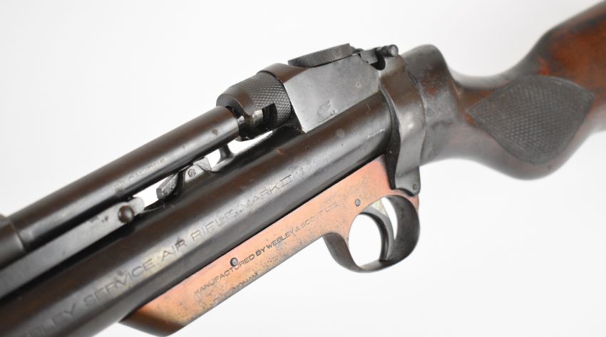 Webley Service Mark II .22 air rifle with interchangeable barrel, adjustable pop-up peep-hole sights and chequered grip, serial number S7949, together with a Webley .22 Air Pistols & Air Rifles pellets tin. PLEASE NOTE: IF YOU REQUIRE POSTAGE, THIS LOT CAN ONLY BE SENT TO AN RFD