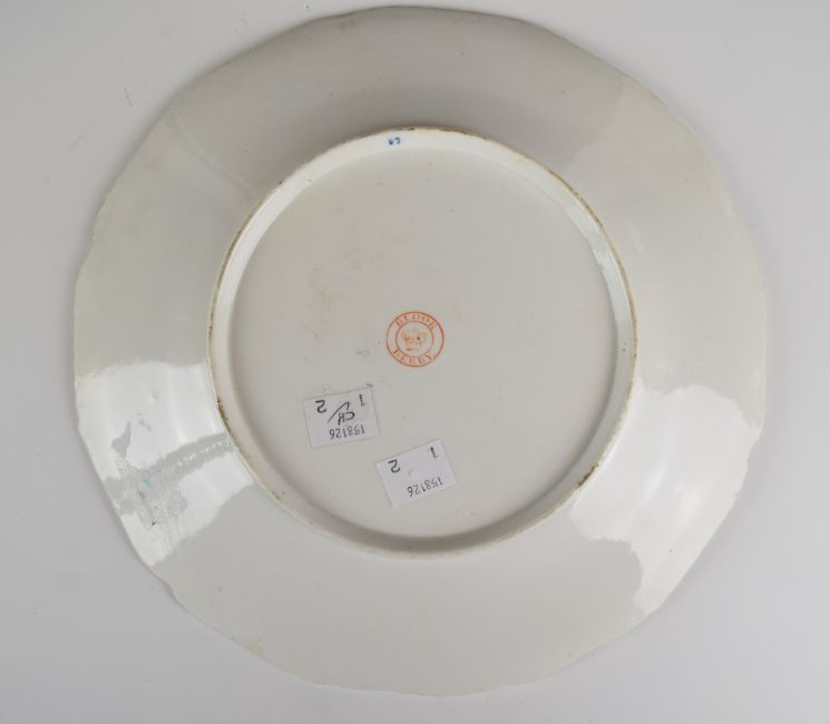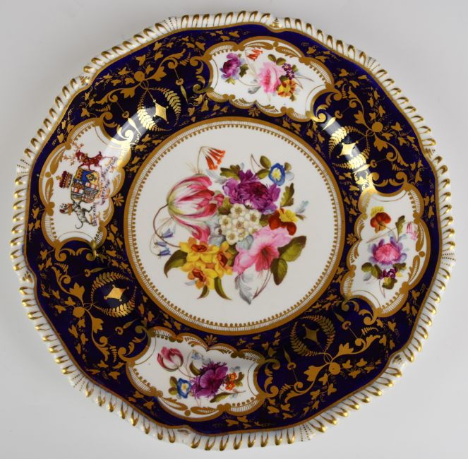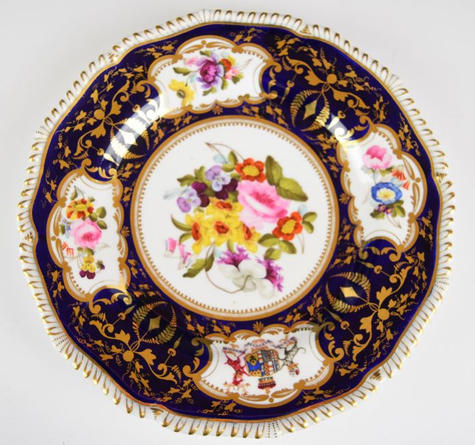 Bloor Derby pair of armorial cabinet plates for the Earl Ferrer dinner service, with hand painted floral decoration and Latin script 'Honor Virtutis Praemium', diameter 26cm