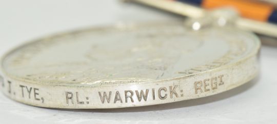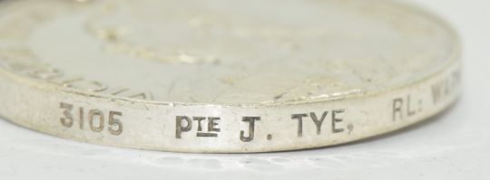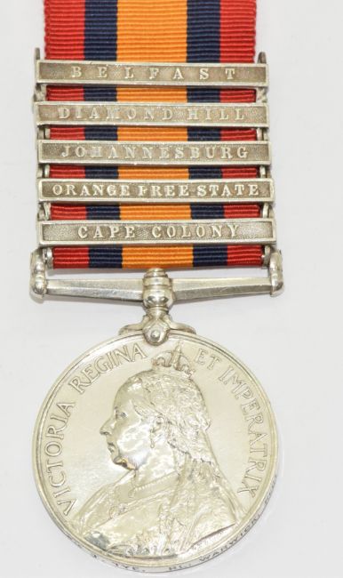 Queen's South Africa Medal with clasps for Cape Colony, Orange Free State, Johannesburg, Diamond Hill and Belfast named to 3105 Pte J Tye, Royal Warwickshire Regiment