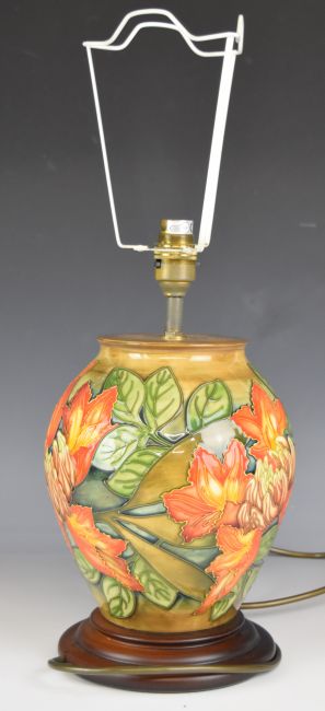 Moorcroft pedestal table lamp decorated in the Flame Of The Forest pattern, H33cm