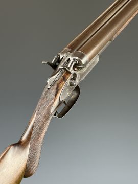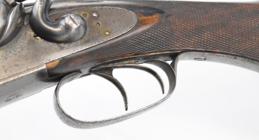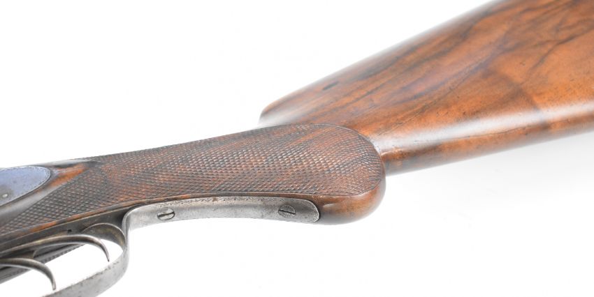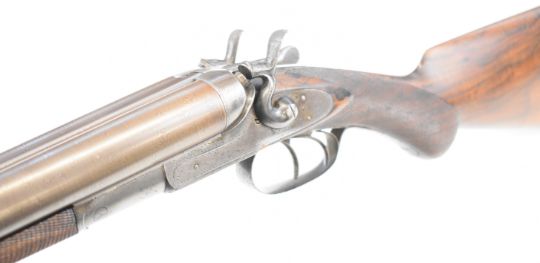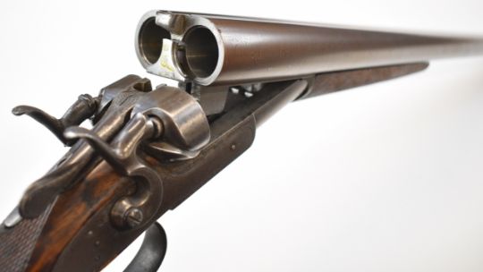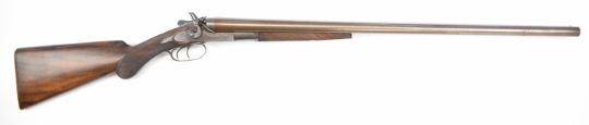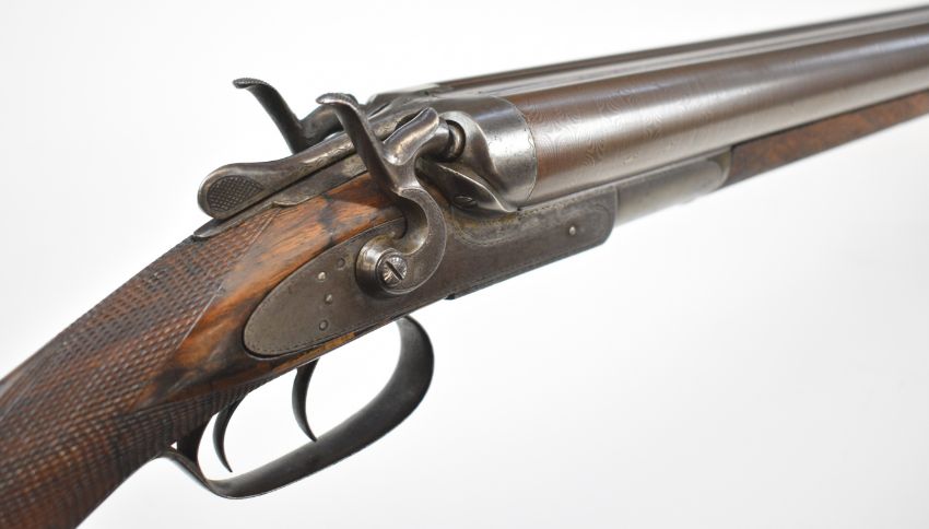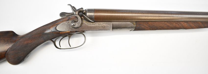 Remington 10 bore side by side hammer action shotgun with border engraved locks, trigger guard, underside, thumb lever and fences, chequered semi-pistol grip and forend, double trigger and 30 inch Damascus barrels, overall length 118cm, length of pull 36cm, serial number 8630. PLEASE NOTE THAT A VALID RELEVANT SHOTGUN CERTIFICATE IS REQUIRED TO VIEW OR PURCHASE THIS LOT AND FOR ALL SHOTGUNS OR RIFLES PLEASE ENSURE YOU HAVE THE RELEVANT CERTIFICATE BEFORE BIDDING.