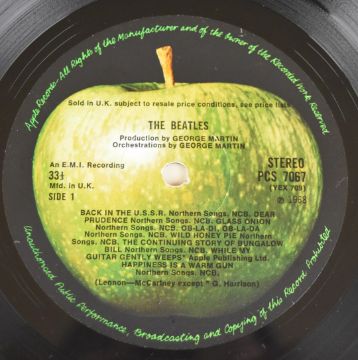 The Beatles (White Album) (PCS 7068) embossed top opening sleeve numbered 0445485, label has 'Sold in the UK' etc, YEX, black inner sleeves, three photos (Lennon, Harrison and Starr) and poster. Vinyl appears VG+