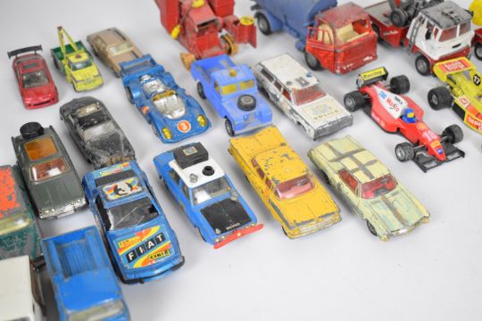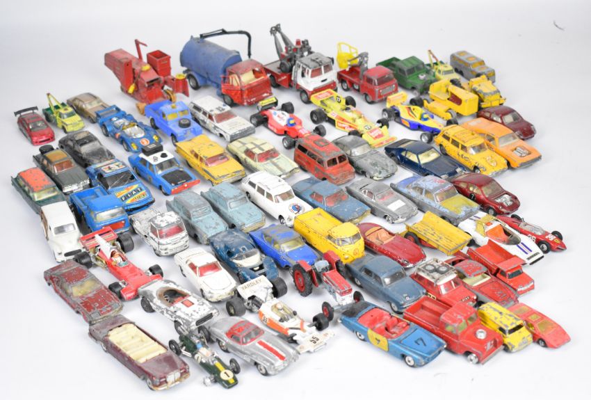 Over sixty vintage Dinky and Corgi diecast model cars and trucks to include Citroen Safari Ski Club, Ford Consul Classic, Buick Riviera, VW 1500 Carmann Chia, Standard Vanguard III, Rover 2000TC and Hillman Hunter.