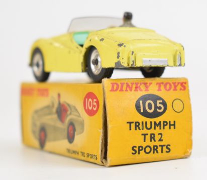 Dinky Toys diecast model Triumph TR2 Sports with lemon body, green interior, driver and silver hubs, 105, in original box.