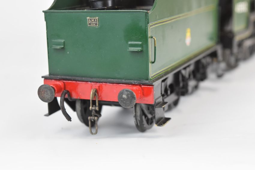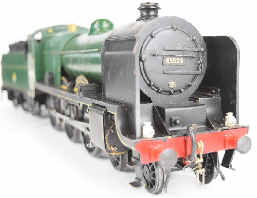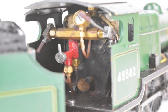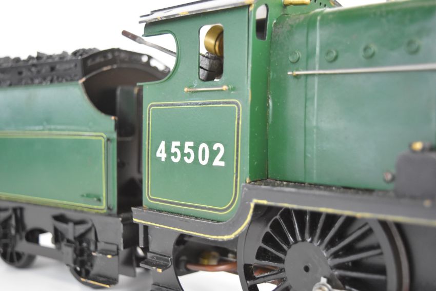 Gauge 1 Patriot live steam 4-6-0 locomotive number 45502 Royal Naval Division, in British Railways green livery, the twin cylinders having slip eccentric valve gear between the frames and faux Walschaerts valve gear to the exterior, with axle and hand feed pumps, the tender also housing the removable meths tank, overall length 65cm, with boiler certificate listing the hydraulic test as having been undertaken on 29-7-2020 and the steam test 22-9-22, in wooden carry box