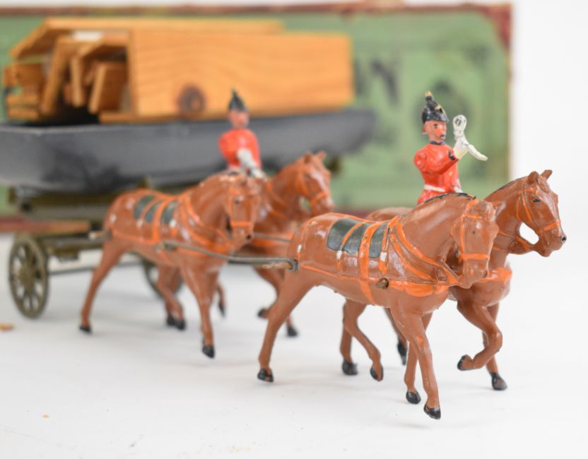 Britains Royal Engineers Pontoon Section comprising four horses, two riders, flat bed carriage, grey painted pontoon, and two wooden road sections, 203, in original box with label.