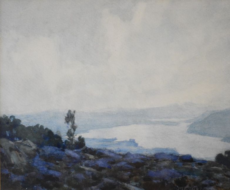 William Heaton Cooper RI (British, 1903-1995) watercolour Lake District landscape 'The Glittering Lake, Windermere', with receipt from The Heaton Cooper Studio, Grasmere, Cumbria, 25 x 30cm, in part gilt frame