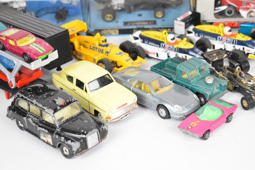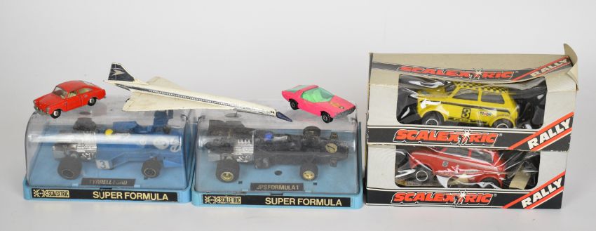 Seven vintage Scalextric slot racing cars to include Formula 1 and Rally examples, some in original boxes, together with a collection of loose diecast.