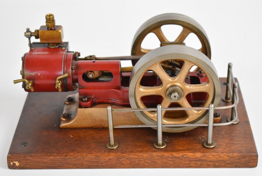 Stuart No 8 live steam single cylinder engine with twin flywheels, throttle valve and twin cylinder drain cocks, on wooden base with miniature handrail, overall length 25.5cm